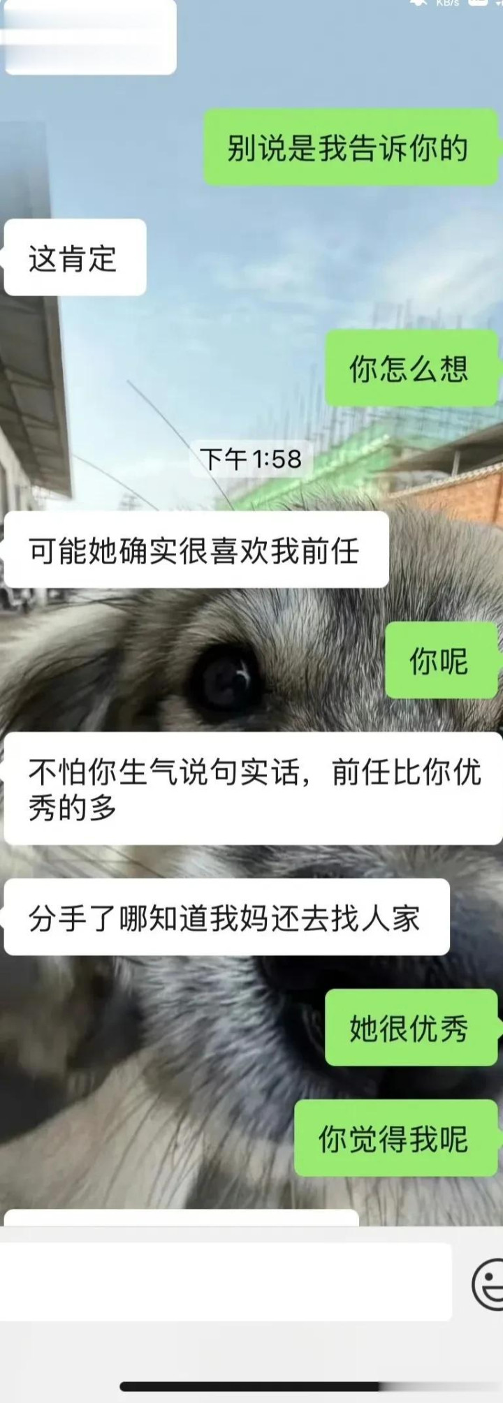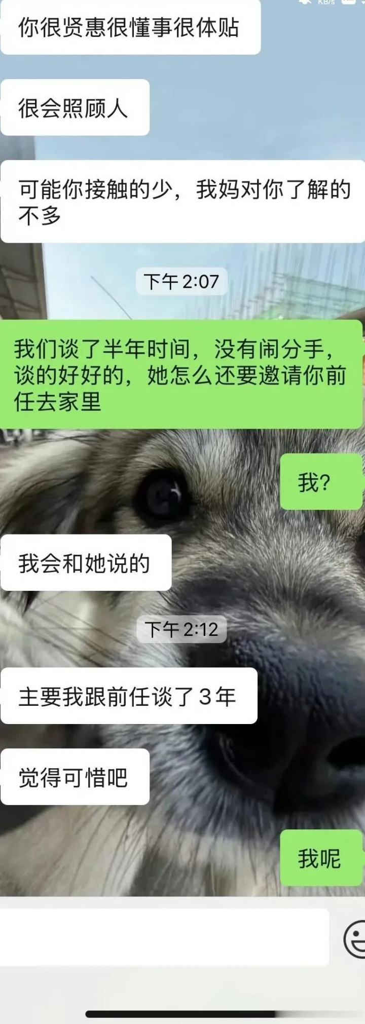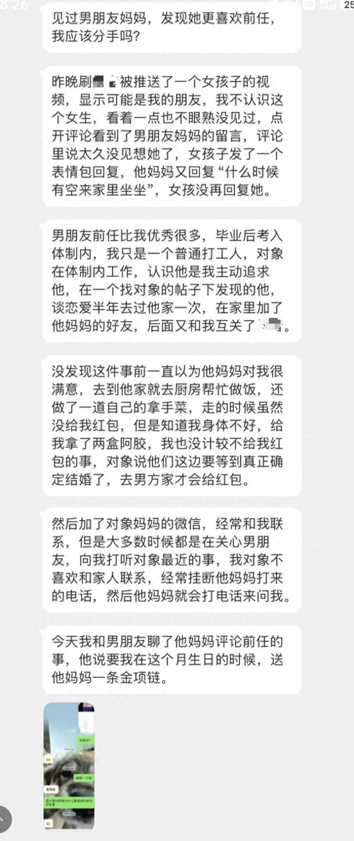 网友神评:他说来说去都是自己妈觉得前任优秀,他也觉得前任优秀,反正都离不开前任优秀四个字,那为什么前任跟他分手,才谈半年,没有时间沉没成本,分了吧。